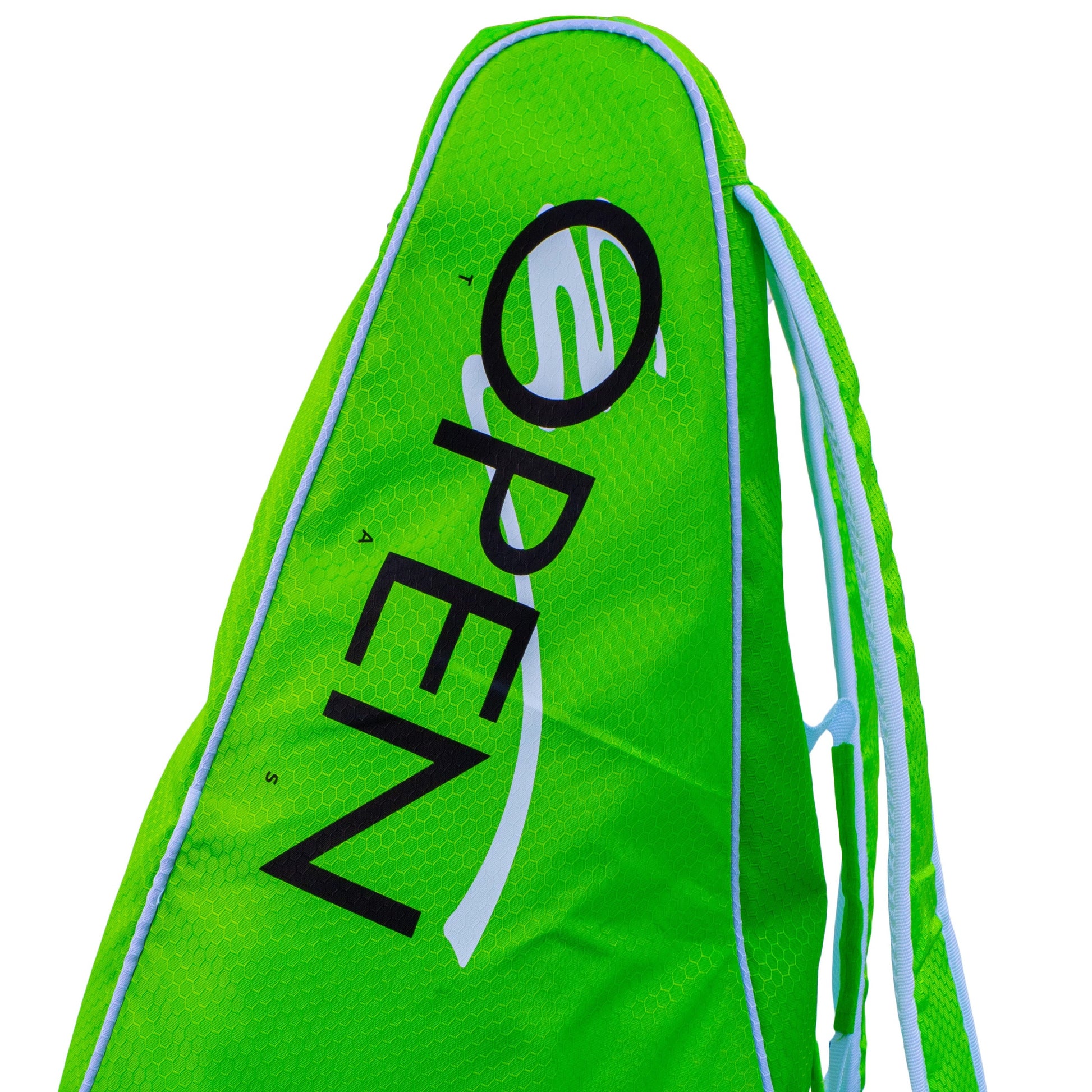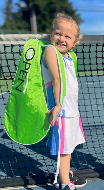 Children's tennis racquet bag 23" long with two compartments. First compartment holds racquets at a maximum length of 21" and second compartment for clothing and equipment.